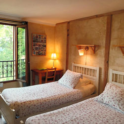 Two twin beds, extra long are the focal point of the rustic well thought out bedroom.