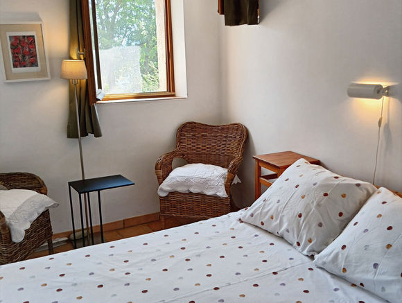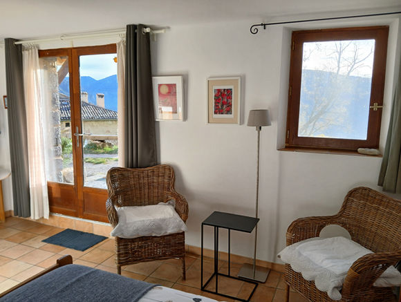 A bright double room with a private entrance and beautiful views of the garden, village, and mountains. Comfortable chairs, a desk, bedside tables, reading lights, and a spacious wardrobe make it easy to settle in. The en‑suite bathroom includes a shower, sink, and toilet
